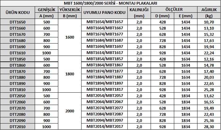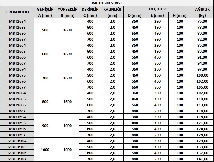MBT Serisi panolarımız kaynaklı imalat yöntemi ile üretilip daha çok sızdırmazlığın önemli olduğu alanlarda ve dış mekan kullanımında tercih edilmektedir. Dış mekan kullanımında yağmur tentesi ile üretilmektedir. MBT 1600 ise 1600mm yüksekliğe sahip olduğunu göstermektedir.