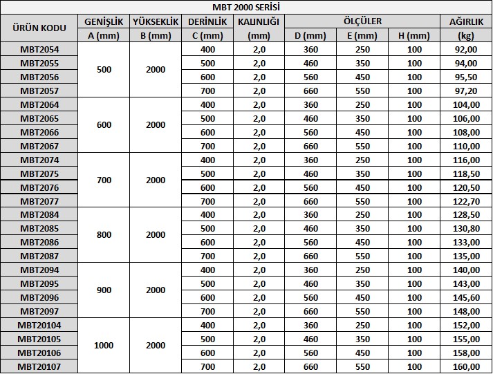MBT Serisi panolarımız kaynaklı imalat yöntemi ile üretilip daha çok sızdırmazlığın önemli olduğu alanlarda ve dış mekan kullanımında tercih edilmektedir. Dış mekan kullanımında yağmur tentesi ile üretilmektedir. MBT 2000 ise 2000mm yüksekliğe sahip olduğunu göstermektedir.